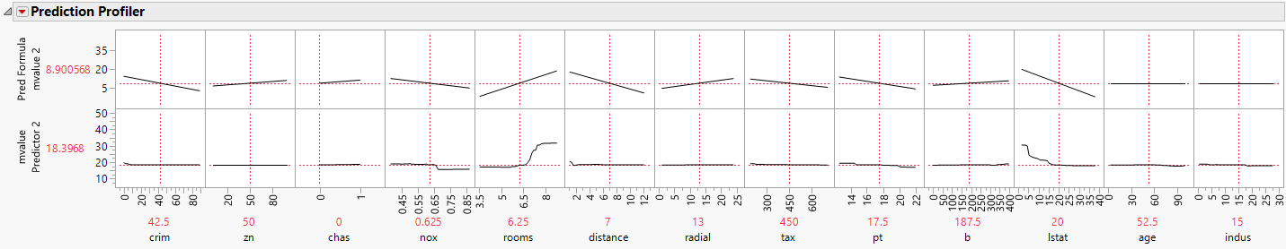 The prediction profiler enables you to compare the impact of each factor in the different models. The profiler is especially interesting when comparing different types of models such as here where you have a regression model and a partition model.
