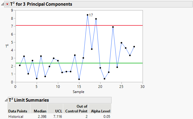 Note that Cool Temp contributes 40% of the T2 value. The Cool Temp bar is green indicating that sample 17 is within the univariate control limits for Cool Temp. Steam Flow and MW each contribute about 20% of the T2 value. They are both red, which indicates that sample 17 is outside of the univariate control limits for each variable. Steam Temp has a zero contribution to the T2 value. In this example, you found variables where the multivariate out-of-control sample could be traced to an out-of-control univariate variable. However, that is not always the case. In multivariate process control you can have an out-of-control point on the T2 chart but find that the sample is in-control at the univariate level for all variables.