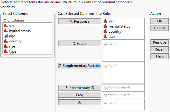 3. Select sex, marital status, country, and size and click Y, Response.