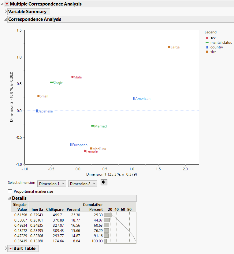 The Correspondence Analysis report shows the cloud of categories of the four variables as projected onto the two principal axes. From this cloud, you can see that Americans have a strong association with the large car size while Japanese are highly associated with the small car size. Also, males are strongly associated with the small car type and females are associated with the medium car size. This information could be used in market research to identify target audiences for advertisements.