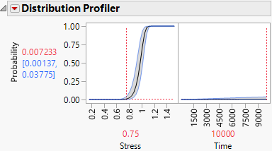 Figure 5.4 shows that the predicted probability of failure for a test unit under constant stress of 0.75 at 10000 time units is 0.007233, with a 95% confidence interval of 0.00137 to 0.03775.