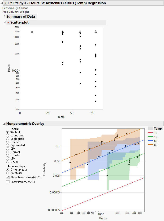 This example uses the Devalt.jmp sample data table, from Meeker and Escobar (1998), and can be found in the Reliability folder of the sample data. It contains time-to-failure data for a device at accelerated operating temperatures. No time-to-failure observation is recorded for the normal operating temperature of 10 degrees Celsius; all other observations are shown as time-to-failure or censored values at accelerated temperature levels of 40, 60, and 80 degrees Celsius.