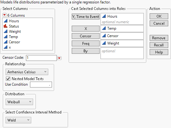 2. Select Analyze > Reliability and Survival > Fit Life by X.