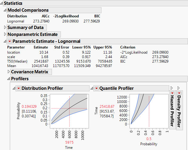 The parameter estimates for the lognormal distribution are provided. The profilers are useful for visualizing the fitted distribution and for estimating probabilities and quantiles. For example, the Quantile Profiler indicates that the estimated median time to failure is 25,418.67 hours.
