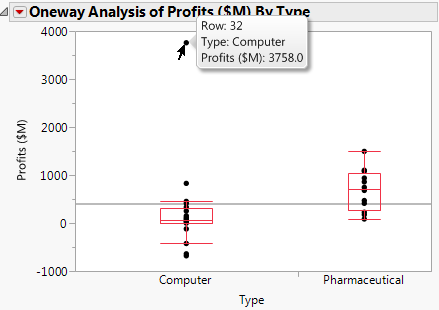 6. Click the red triangle next to Oneway Analysis of Profits ($M) By Type and select Display Options > Box Plots.