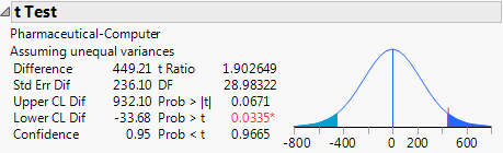 Suppose you want to test whether the mean profit earned by companies differs by type of company. In Companies.jmp, the data consist of various metrics on two types of companies, Pharmaceutical (12 companies) and Computer (20 companies).