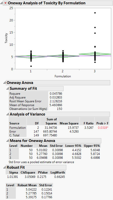 If you look at the standard Analysis of Variance report, you might wrongly conclude that there is a difference between the three formulations, since the p-value is 0.0319. However, when you look at the Robust Fit report, you would not conclude that the three formulations are significantly different, because the p-value there is 0.21755. It appears that the toxicity for a few of the observations is unusually high, creating the undue influence on the data.