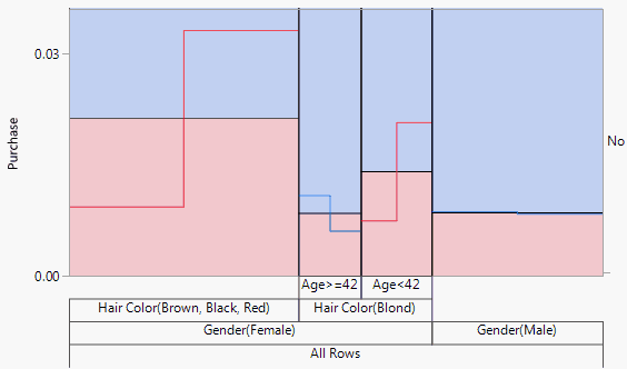 The graph indicates that uplift in purchases occurs for females with black, red, or brown hair and for younger females (Age < 42) with blond hair. For older blond-haired women (Age 42) and males, the promotion has a negative effect.