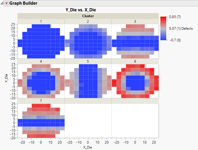 In this example, you have defect data on wafers. The X Die and Y Die columns give a location on the die, and Defects gives the number of defects at each location. Because die defects often occur in patterns, you use cluster analysis to cluster wafers into groups that might have the same type of defect pattern. Once you have done this, you want to visualize the defect patterns for each cluster.