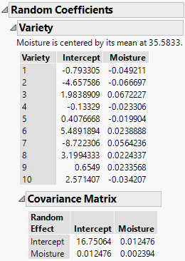 The Random Effects Covariance Parameter Estimates report gives estimates of the variance of the varieties’ intercepts, Var(Intercept), and slopes, Var(Moisture), and their covariance, Cov(Moisture, Intercept). In this case, the intercept and slope are not significantly correlated, because the confidence interval for the estimate includes zero. The report also gives an estimate of the residual variance.