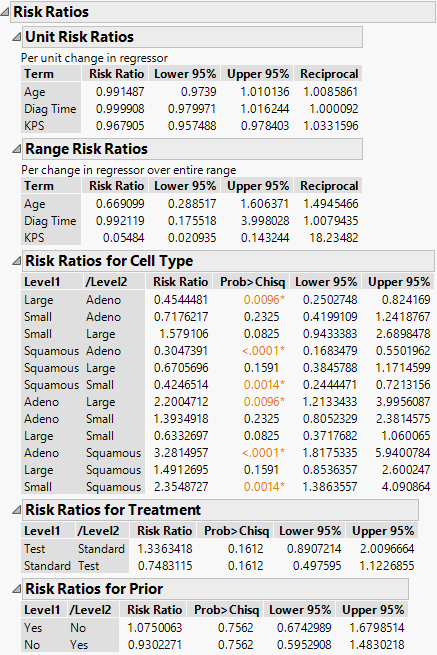 For the nominal effect, Cell Type, all pairs of levels are calculated and are shown in the Risk Ratios for Cell Type table. Note that for a categorical variable with k levels, only k -1 design variables, or levels, are used. In the Parameter Estimates table, parameter estimates are shown for only three of the four levels for Cell Type (Adeno, Large, and Small). The Squamous level is not shown, but it is calculated as the negative sum of the other estimates. Here are two example Risk Ratios for Cell Type calculations: