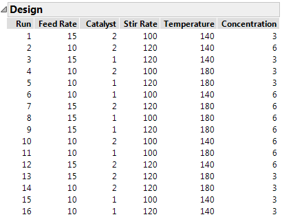 4. Select Feed Rate, Catalyst, Stir Rate, Temperature, and Concentration, and click X, Factor.