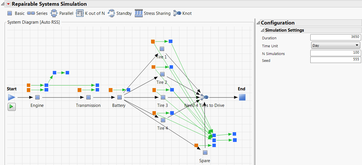 Example Using the Repairable Systems Simulation PlatformIn this example, you run 100 iterations of a simulation of a car system and analyze the system’s estimated outage time over the course of 10 years.