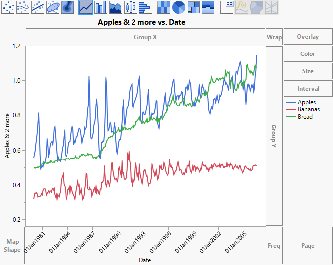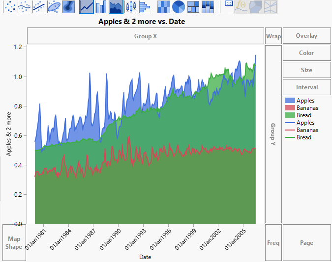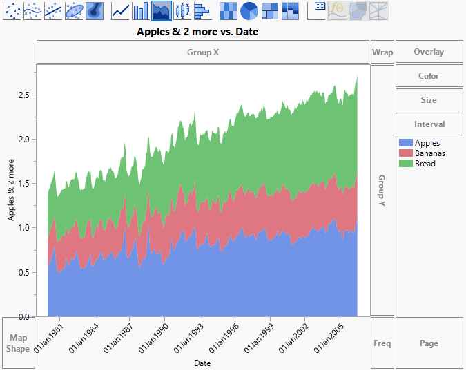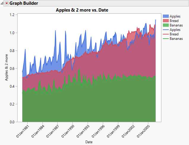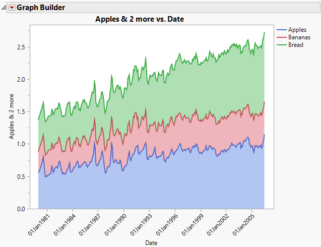 Because banana prices are uniformly smaller than prices for apples and bread, the layer for Bananas is at first entirely hidden behind the other two layers. The apples price is hidden behind the bread price for some months. Use the Line element to see prices for all three clearly.