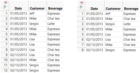 You can see that some of the customers had the same drink on the same date. You want to consolidate these duplicate rows using Join.