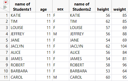 The Students1.jmp data table contains names, ages, and sexes of the students. The Students2.jmp data table contains names, height, and weight of the students. Instead of working with two separate tables, you would like to combine the tables into one. Notice that the students’ names are not in the same order in both tables. For example, Alice is in row 7 and row 9.