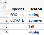 Notice that the Species1.jmp table has two rows, and the Species2.jmp table has four rows.