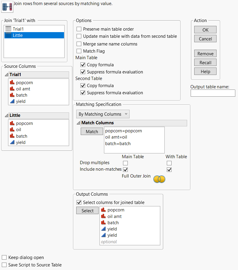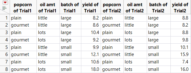 In the joined table, you want only one column for popcorn, one column for oil, and one column for batch. However, you want two columns for yield: one representing the yield from Trial1.jmp, and another representing the yield from Little.jmp.