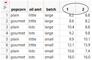 1. Select Help > Sample Data Library and open Popcorn.jmp.