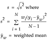 The sample standard deviation, computed for the nonmissing values and calculated with the specified weight variable. It is the square root of the sample variance. The formula follows: