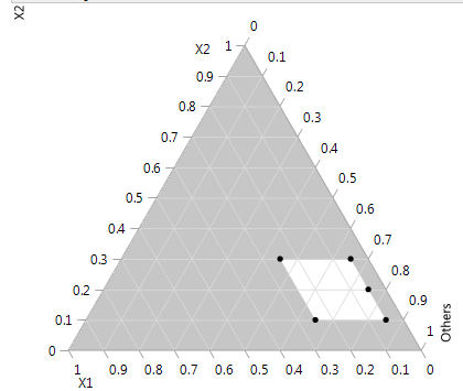 The ternary plot shows the feasible region as defined by the factor limits and the linear constraints. The design points are at the six vertices of the feasible region, at the six edge mid-points, and the overall centroid. For more information about ternary plots, see Ternary Plot Overview.