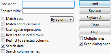 In the data table, select a value. Select Edit > Search > Use Selection for Find. Next, select Edit > Search > Find. The value that you selected in the data table is already entered in the Find what field.