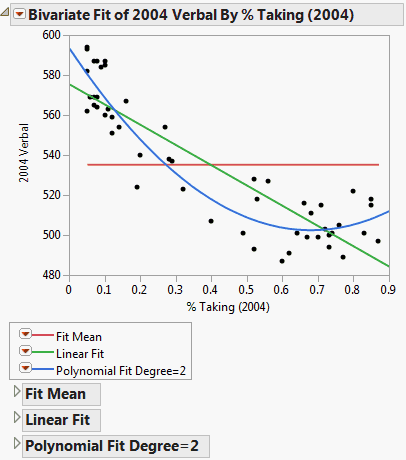 For more information about the options in the Linear Fit and Polynomial Fit Degree menus, see Fitting Menus. For statistical details about this fit, see Fit Line.