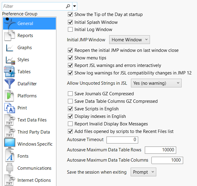 Most General preferences customize your JMP session at start-up. Others set preferences for file handling and the general appearance of the JMP workspace.