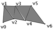 Draws a series of triangles (three-sided polygons) using vertices v0, v1, v2, then v2, v1, v3 (note the order), then v2, v3, v4, and so on. The ordering is to ensure that the triangles are all drawn with the same orientation so that the strip can correctly form part of a surface. There must be at least three vertices for anything to be drawn.