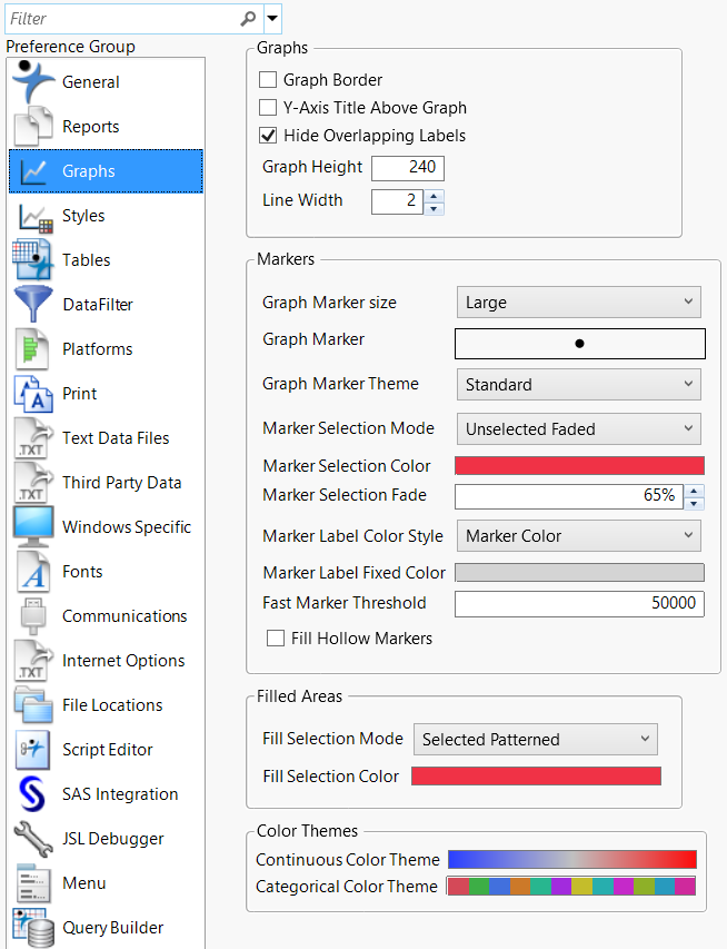Select a default size for the markers in graphs: Dot, Small, Medium, Large, XL, XXL, or XXXL. This preference is applied when the marker size is set to Preferred on a graph.