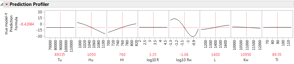 The profiler defaults to the center of the design region. If there were no bias, all profile traces would be constant between the value ranges of each factor. In this example, the variables logRw, Hu, and Hl show the largest effects on the bias.