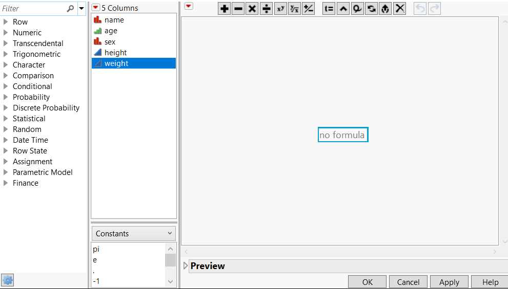 Formulas can be simple assignments of numeric, character, or row state constants, or they can contain complex evaluations based on conditional clauses. Constants include commonly used numeric terms, such as e, pi, -1, 0, 1, and 2. There are two ways to add a constant value to a formula: