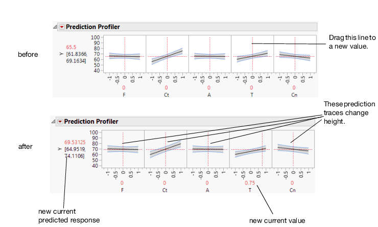 If you change the value of a factor, the prediction trace for that factor is not affected, but the prediction traces of all the other factors can change. The Y response line must cross the intersection points of the prediction traces with their current value lines.