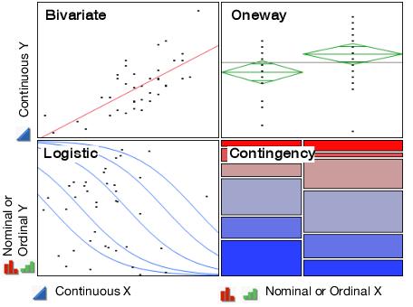 The Fit Y by X platform analyzes the pair of X and Y variables that you specify, by context, based on modeling type.