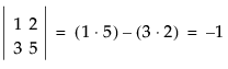 The Det() function returns the determinant of a square matrix. The determinant of a 2 × 2 matrix is the difference of the diagonal products, as demonstrated below. Determinants for n × n matrices are defined recursively as a weighted sum of determinants for (n - 1) × (n - 1) matrices. For a matrix to have an inverse, the determinant must be nonzero.