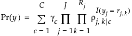 The probability of observing a specific vector of responses yw = y1,..., yj is the sum of the conditional probabilities of observing that vector of responses for each of the C latent classes: