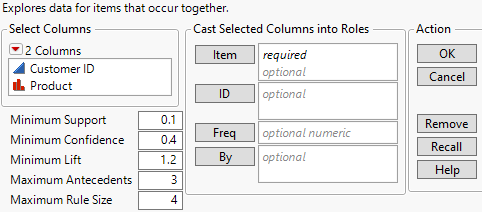 • You can specify a Multiple Response modeling type column for the Item role. In this format, the Item role is required, the ID and Freq roles are optional. If an ID role is specified, all rows with the same ID are combined into one transaction. If a Freq role is specified, the frequency applies to the transaction, not the specific items in the transaction.