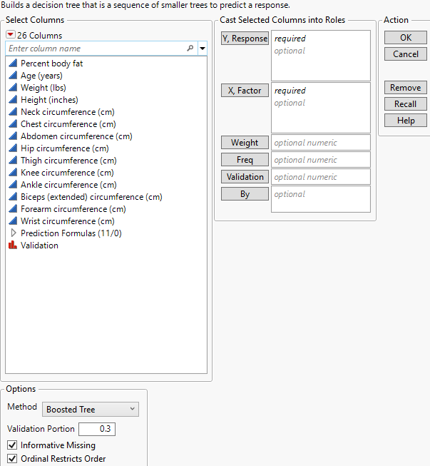 Figure 6.6 Boosted Tree Launch Window Using Body Fat.jmp