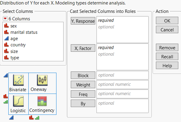 For more information about this launch window, see Introduction to Fit Y by X. For more information about the options in the Select Columns red triangle menu, see Column Filter Menu in Using JMP.