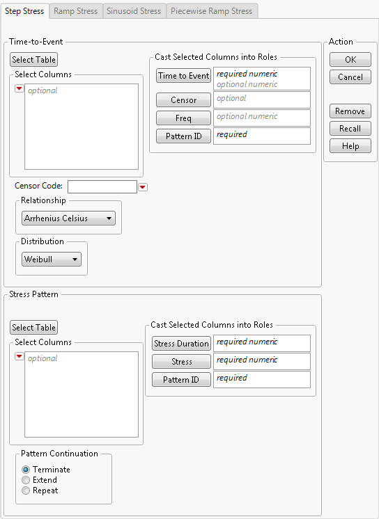 The launch window includes a separate tab for each step-stress data format. For more information about the various stress patterns, see Stress Pattern. For more information about the options in the Select Columns red triangle menu, see Column Filter Menu in Using JMP.