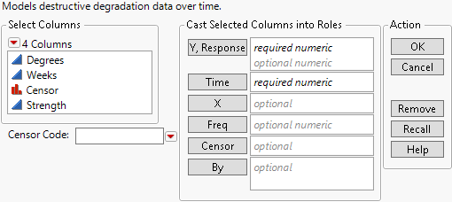 Identifies an optional explanatory variable. If the distribution of Y changes not only over time, but is also impacted by some other variable, that additional variable can be supplied as X. Use this role to specify the accelerating factor in an accelerated destructive degradation model.