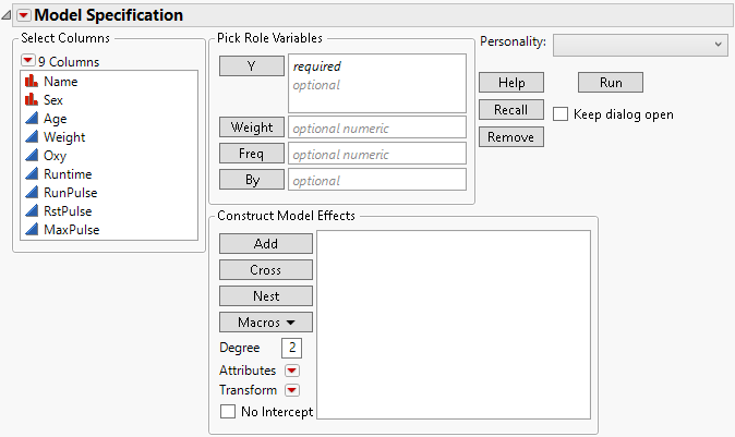 Launch the Fit Model platform by selecting Analyze > Fit Model. Figure 2.3 shows an example of the launch window for the Fitness.jmp sample data table. The Fit Model launch window is a common launch window for many platforms that are called Personalities. See Fitting Personalities.
