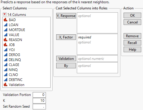 Launch the K Nearest Neighbors PlatformLaunch the K Nearest Neighbors platform by selecting Analyze > Predictive Modeling > K Nearest Neighbors.