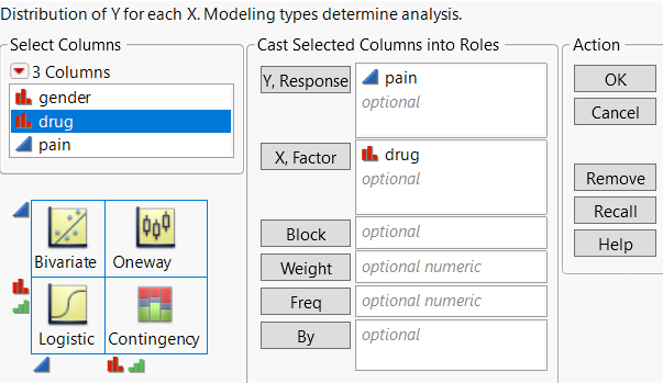 For more information about this launch window, see Introduction to Fit Y by X. For more information about the options in the Select Columns red triangle menu, see Column Filter Menu in Using JMP.