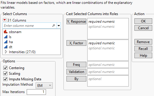 Select Analyze > Fit Model and select Partial Least Squares from the Personality menu. This approach enables you to do the following: