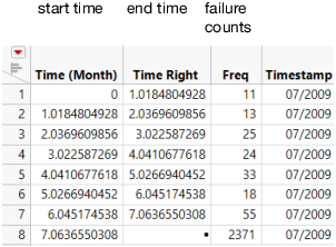 The Time to Event format shows production and failure data. Unlike the Nevada and Dates formats, Time to Event data does not include date-time information, such as production or failure dates. This format can also accommodate arbitrary censoring schemes in the data. See Defining Risk Sets with Time to Event Data.