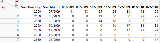 Contract data is commonly stored in the Nevada format: shipment or production dates and failure counts within specified periods are shaped like the state of Nevada. Figure 9.8 shows the Small Production.jmp sample data table.