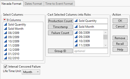 The launch window includes a tab for each contract data format: Nevada, Dates, and Time to Event (for time to failure data). The following sections describe these formats.