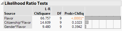 Figure 5.17 shows the Likelihood Ratio Tests report obtained by running the script MaxDiff for Flavor in Potato Chip Responses.jmp.