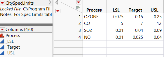 A tall table contains four or five columns and has one row for each process. The first column has a character data type and contains the names of the columns analyzed in the Process Capability platform. The next three columns need to be named LSL, Target, and USL. These column names can also be preceded by an underscore character. The optional final column named Show Limits specifies if the specification limits are shown as reference lines in select analysis plots.